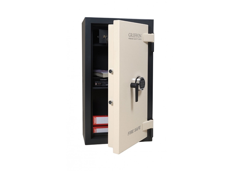Brand-/ sikkerhedsskabe – Griffon FS90E – Brand 30min fås med nøglelås eller en elektronisk lås.